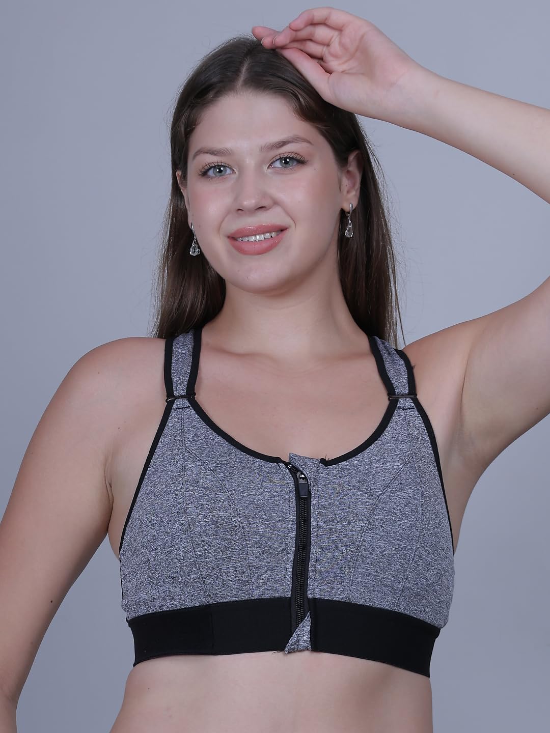 Fabme Women Polyester Spandex High Impact Front Zip Sports Bra Longline Fitness Criss Cross Back Crop Tops for Gym, Yoga & Workout Size: S-3XL Grey