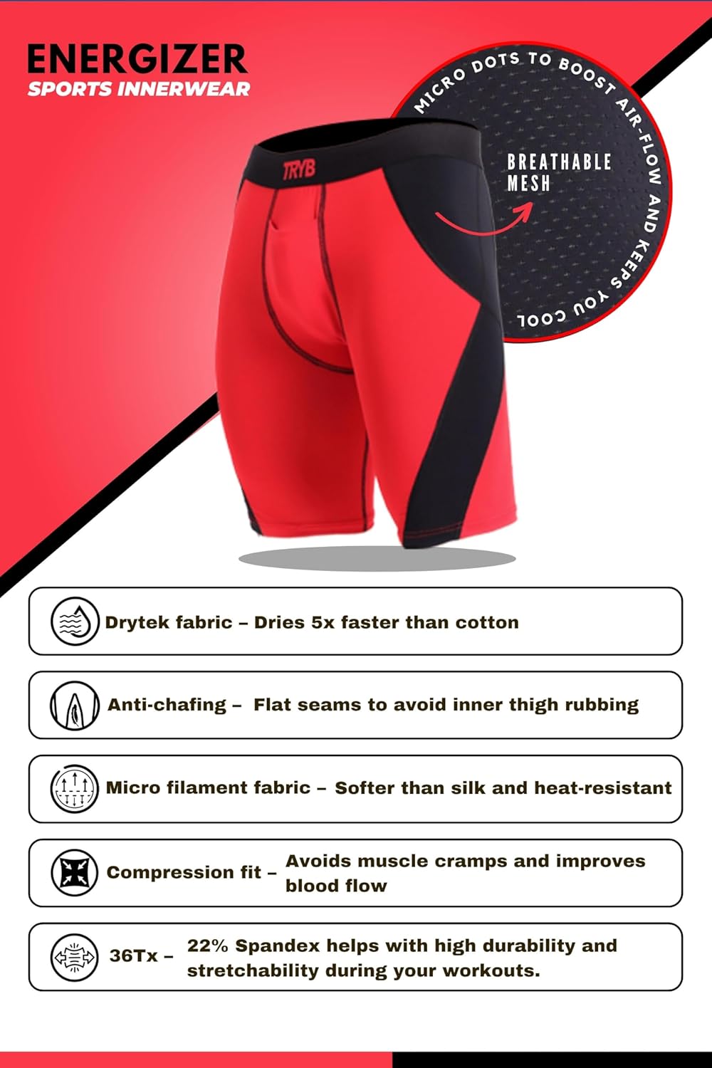 - India’s First Sports Innerwear: Designed for intense workouts, sports, and everyday active wear. TRYB men’s underwear ensures unmatched comfort and flexibility, making it the perfect choice for athletes and active individuals looking for running underwear for men